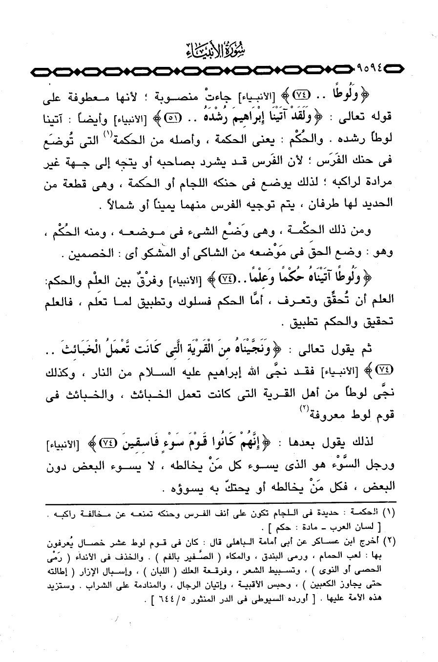 {وَلُوطاً ... } [الأنبياء: 74] جاءتْ منصوبة؛ لأنها معطوفة على قوله تعالى: {وَلَقَدْ آتَيْنَآ إِبْرَاهِيمَ رُشْدَهُ ... } [الأنبياء: 51] وأيضاً: آتينا لوطاً رشده. والحُكْم: يعني الحكمة، وأصله من الحكمة التي تُوضَع في حنك الفَرَس؛ لأن الفَرس قد يشرد بصاحبه أو يتجه إلى جهة غير مرادة لراكبه؛ لذلك يوضع في حنكه اللجام أو الحَكمة، وهي قطعة من الحديد لها طرفان، يتم توجيه الفرس منهما يميناً أو شمالاً.