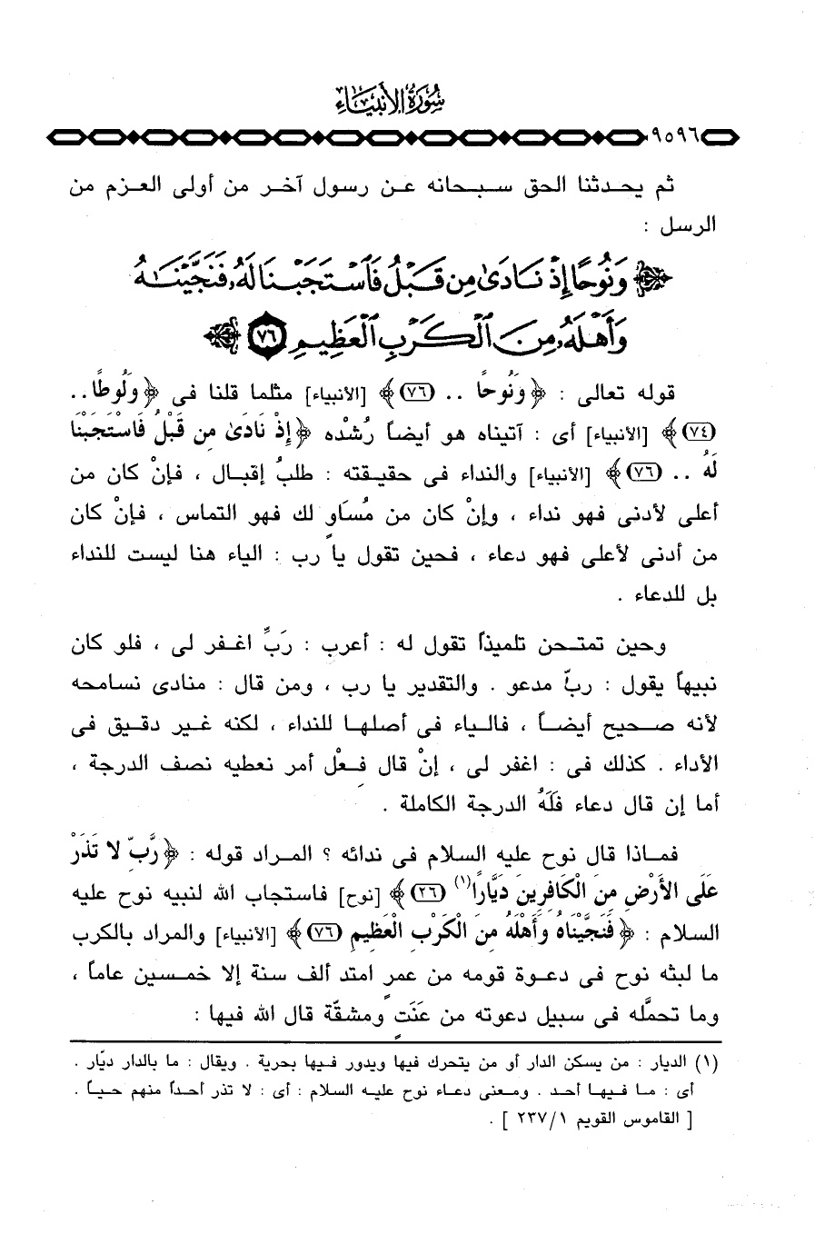 قوله تعالى: {وَنُوحاً ... } [الأنبياء: 76] مثلما ثلنا في {وَلُوطاً ... } [الأنبياء: 74] أي: آتيناه هو أيضاً رُشْده {إِذْ نادى مِن قَبْلُ فاستجبنا لَهُ ... } [الأنبياء: 76] والنداء في حقيقته: طلبُ إقبال، فإنْ كان من أعلى لأدنى فهو نداء، وإنْ كان من مُسَأوٍ لك فهو التماس، فإنْ كان من أدنى لأعلى فهو دعاء، فحين تقول يا رب: الياء هنا ليست للنداء بل للدعاء.