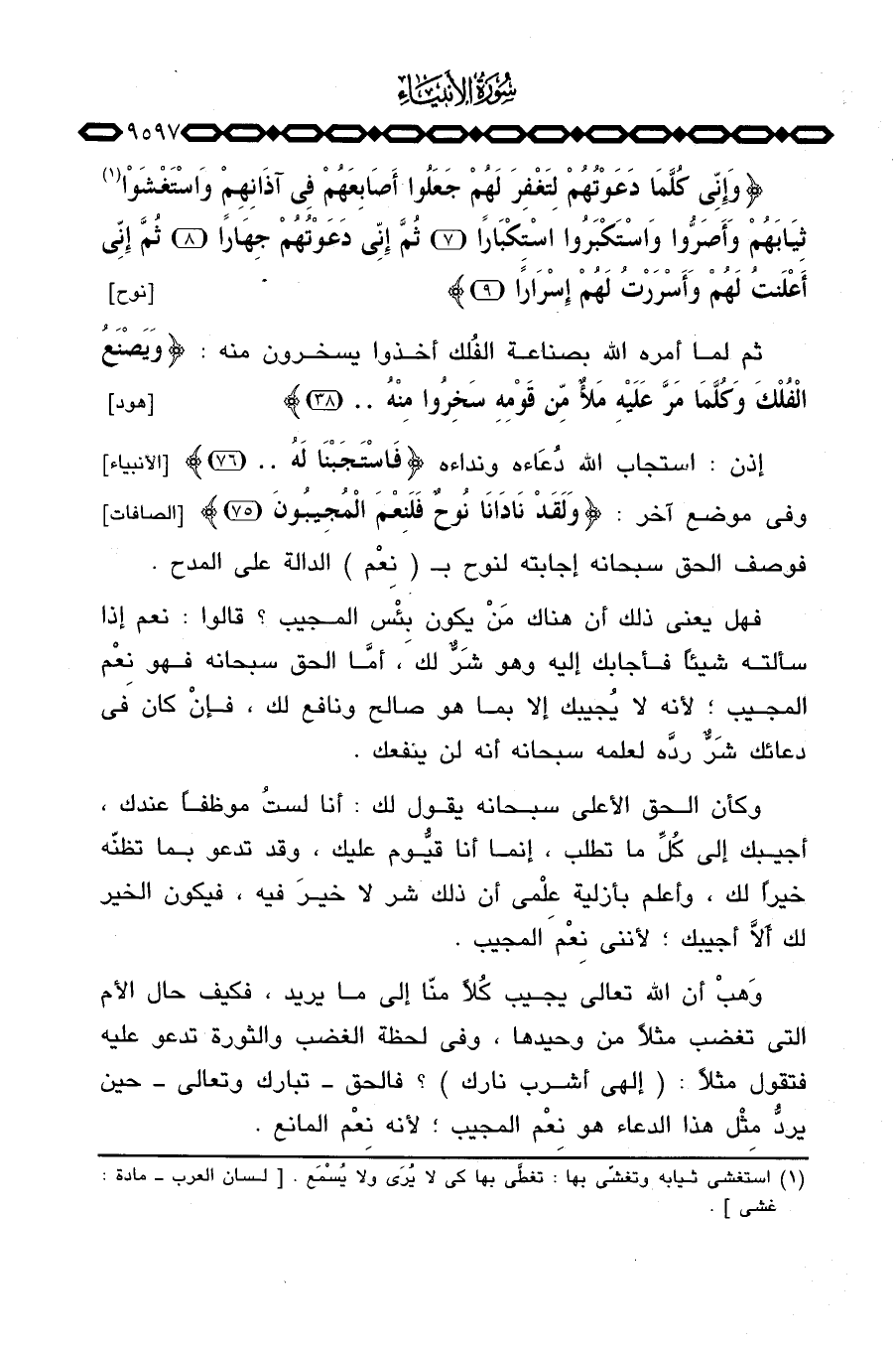 وهَبْ أن الله تعالى يجيب كُلاً منّا إلى ما يريد، فكيف حال الأم التي تغضب مثلاً من وحيدها، وفي لحظة الغضب والثورة تدعو عليه فتقول مثلاً: (إلهي أشرب نارك) ؟ فالحق - تبارك وتعالى - حين يردُّ مِثْل هذا الدعاء هو نِعْم المجيب؛ لأنه نِعْم المانع.