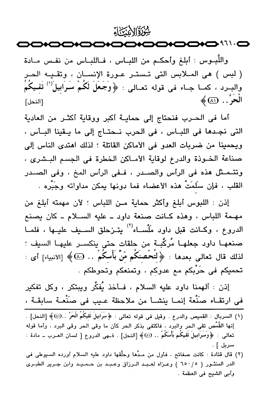 إذن: ألهمنا داود عليه السلام، فأخذ يُفكِّر ويبتكر، وكل تفكير في ارتقاء صَنْعه إنما ينشأ من ملاحظة عيب في صَنْعة سابقة،