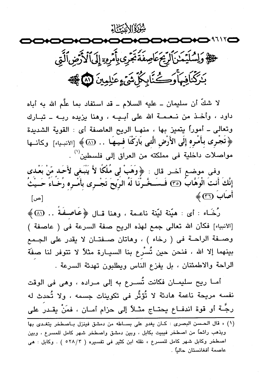 لا شكّ أن سليمان - عليه السلام - قد استفاد بما علَّم الله به أباه داود، وأخذ من نعمة الله على أبيه، وهنا يزيده ربه - تبارك وتعالى - أموراً يتميز بها، منها الريح العاصفة أي: القوية الشديدة {تَجْرِي بِأَمْرِهِ إِلَى الأرض التي بَارَكْنَا فِيهَا ... } [الأنبياء: 81] وكأنها مواصلات داخلية في مملكته من العراق إلى فلسطين.