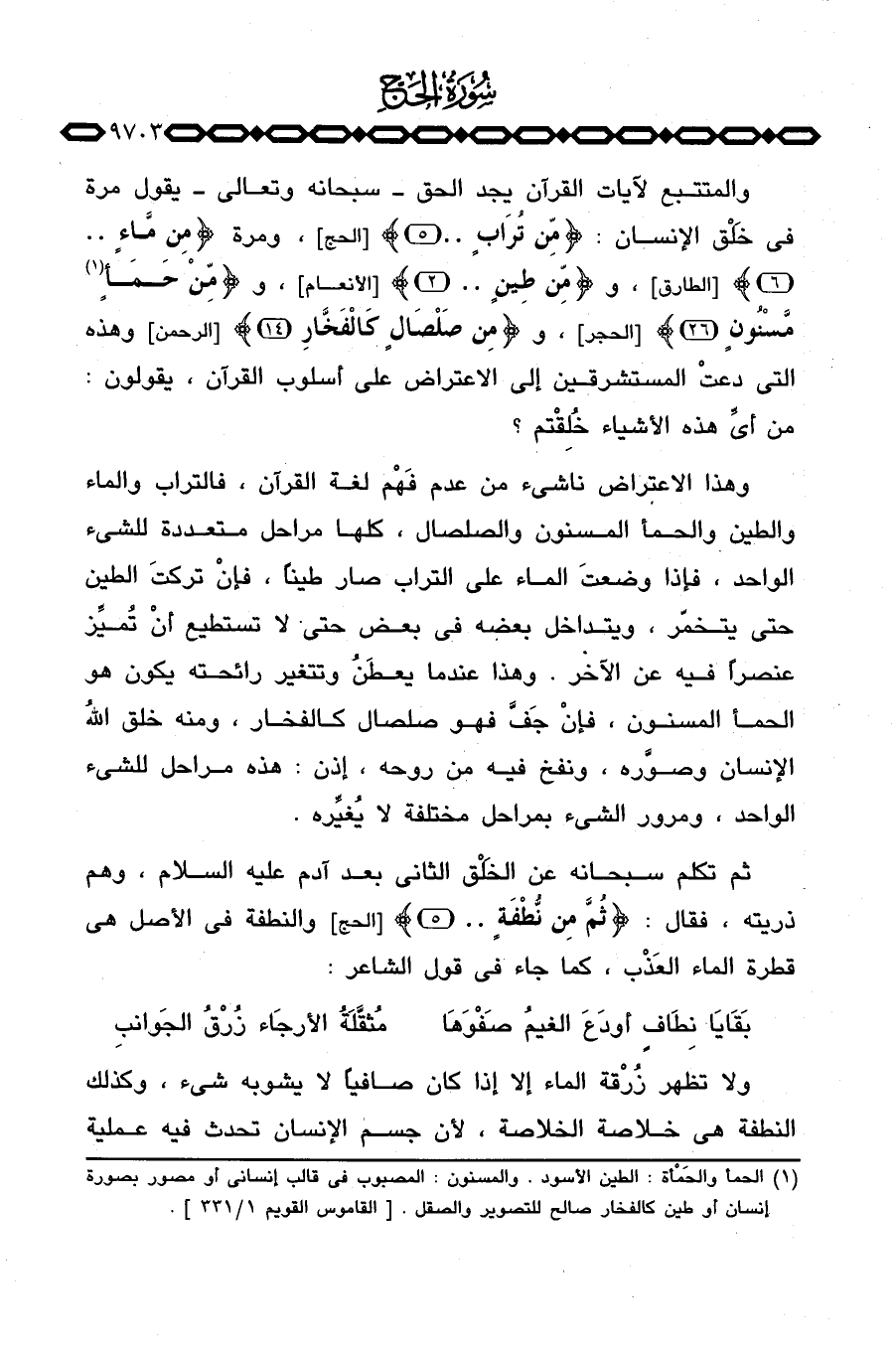 والمتتبع لآيات القرآن يجد الحق - سبحانه وتعالى - يقول مرة في خَلْق الإنسان: {مِّن تُرَابٍ. .} [الحج: 5] ، ومرة {مِن مَّآءٍ. .} [الطارق: 6] ، و {مِّن طِينٍ. .} [الأنعام: 2] ، و {مِّنْ حَمَإٍ مَّسْنُونٍ. .} [الحجر: 26] ، و {مِن صَلْصَالٍ كالفخار. .} [الرحمن: 14] وهذه التي دعتْ المستشرقين إلى الاعتراض على أسلوب القرآن، يقولون: من أيِّ هذه الأشياء خُلِقْتم؟