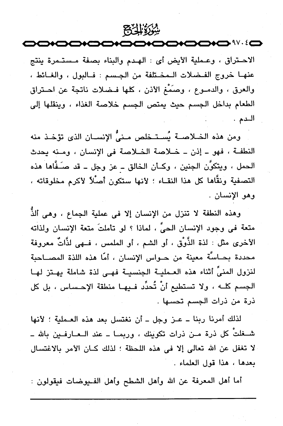 لذلك أمرنا ربنا - عَزَّ وَجَلَّ - أن نغتسل بعد هذه العملية؛ لأنها شغلتْ كل ذرة من ذرات تكوينك، وربما - عند العارفين بالله - لا تغفل عن الله تعالى إلا في هذه اللحظة؛ لذلك كان الأمر بالاغتسال بعدها، هو قول العلماء.
