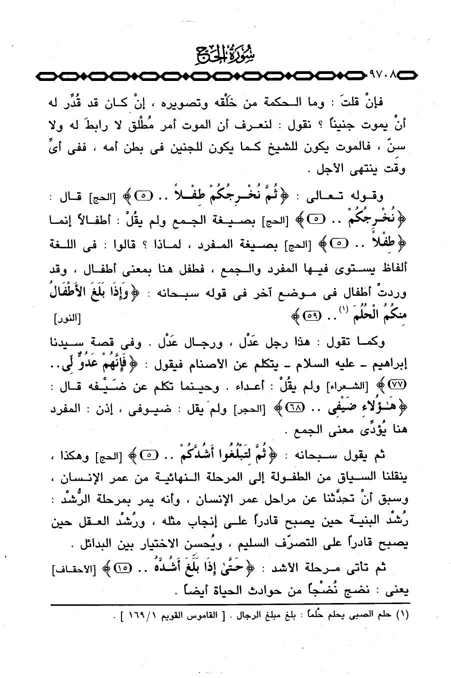 وقوله تعالى: {ثُمَّ نُخْرِجُكُمْ طِفْلاً. .} [الحج: 5] قال: {نُخْرِجُكُمْ. .} [الحج: 5] بصيغة الجمع ولم يقُلْ: أطفالاً إنما {طِفْلاً. .} [الحج: 5] بصيغة المفرد، لماذا؟ قالوا: في اللغة ألفاظ يستوي فيها المفرد والجمع، فطفل هنا بمعنى أطفال، وقد وردتْ أطفال في موضع آخر في قوله سبحانه:
