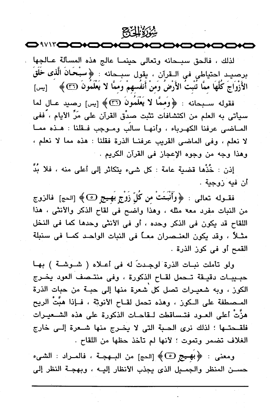 فقوله تعالى: {وَأَنبَتَتْ مِن كُلِّ زَوْجٍ بَهِيجٍ} [الحج: 5] فالزوج من النبات مفرد معه مثله، وهذا واضح في لقاح الذكر والأنثى، هذا اللقاح قد يكون في الذكر وحده، أو في الأنثى وحدها كما في النخل مثلاً، وقد يكون العنصران معاً في النبات الواحد كما في سنبلة القمح أو كوز الذرة.