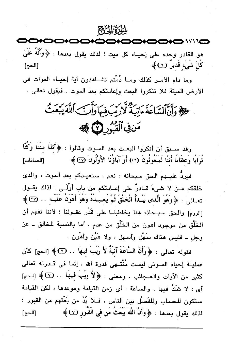 فقوله تعالى: {وَأَنَّ الساعة آتِيَةٌ لاَّ رَيْبَ فِيهَا. .} [الحج: 7] كأن عملية إحياء الموتى ليست مُنْتهى قدرة الله، إنما في قدرته تعالى كثير من الآيات والعجائب، ومعنى: {لاَّ رَيْبَ فِيهَا. .} [الحج: 7] أي: لا شَكَّ فيها. والساعة: أي: زمن القيامة وموعدها، لكن القيامة ستكون للحساب وللفَصْل بين الناس، فلا بُدَّ من بَعْثهم من القبور؛ لذلك يقول بعدها: {وَأَنَّ الله يَبْعَثُ مَن فِي القبور} [الحج: 7] .