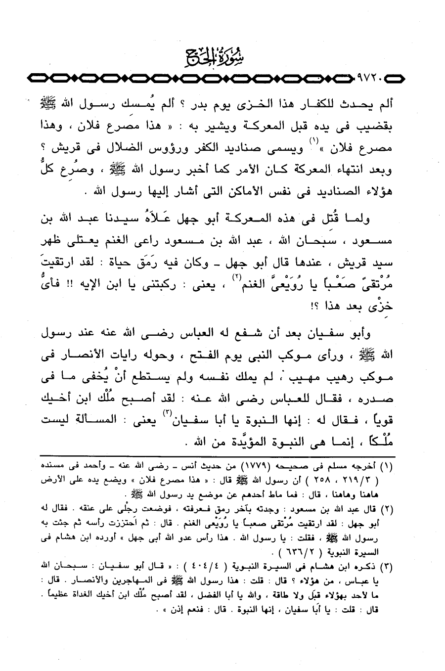 وأبو سفيان بعد أن شفع له العباس رَضِيَ اللَّهُ عَنْه عند رسول الله صَلَّى اللَّهُ عَلَيْهِ وَسَلَّم َ، ورأى موكب النبي يوم الفتح، وحوله رايات الأنصار في موكب رهيب مهيب، لم يملك نفسه ولم يستطع أنْ يُخفي ما في صدره، فقال للعباس رضي الله: لقد أصبح مُلْك ابن أخيك قوياً، فقال له: إنها النبوة يا أبا سفيان يعني: المسألة ليست مُلْكاً، إنما هي النبوة المؤيَّدة من الله.