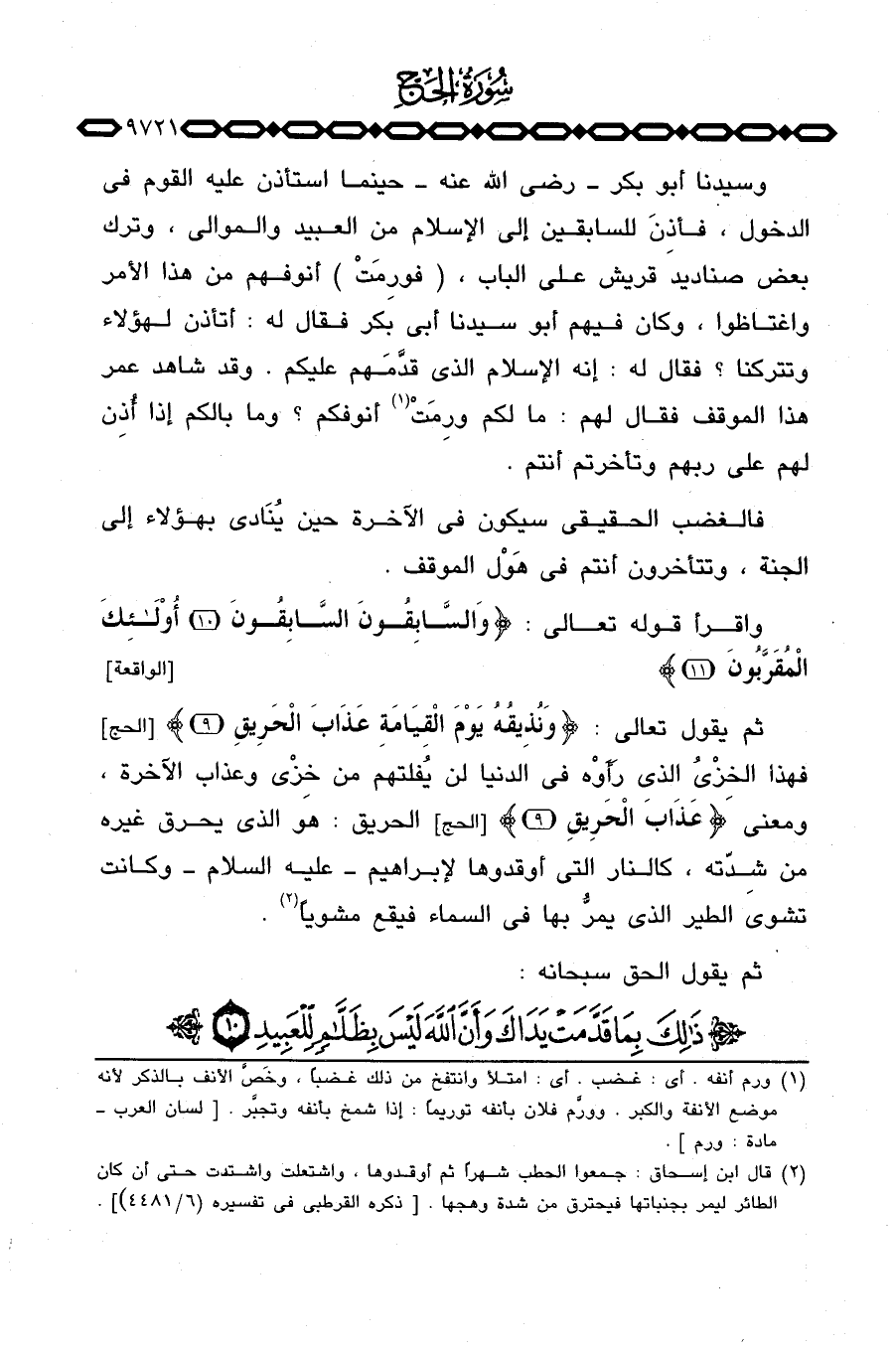 ثم يقول تعالى: {وَنُذِيقُهُ يَوْمَ القيامة عَذَابَ الحريق} [الحج: 9] فهذا الخِزْيُ الذي رَأَوْه في الدنيا لن يُفلتهم من خِزْي وعذاب الآخرة، ومعنى {عَذَابَ الحريق} [الحج: 9] الحريق: هو الذي يحرق غيره من شِدتّه، كالنار التي أوقدوها لإبراهيم - عليه السلام - وكانت تشوي الطير الذي يمرُّ بها في السماء فيقع مشوياً. ثم يقول الحق سبحانه: {ذلك بِمَا قَدَّمَتْ يَدَاكَ وَأَنَّ. .} .