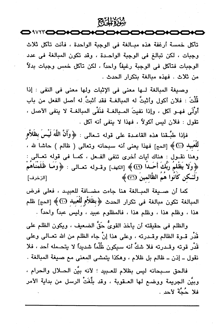 وصيغة المبالغة لها معنى في الإثبات ولها معنى في النفي: إذا قُلْتَ: فلان أكول وأثبتَّ له المبالغة فقد أثبتَّ له أصل الفعل من باب أَوْلَى فهو آكل، وإذا نفيتَ المبالغة فنَفْي المبالغة لا ينفي الأصل، تقول: فلان ليس أكولاً، فهذا لا ينفي أنه آكل. فإذا طبَّقنا هذه القاعدة على قوله تعالى: {وَأَنَّ الله لَيْسَ بِظَلاَّمٍ لِّلعَبِيدِ} [الحج: 10] فهذا يعني أنه سبحانه وتعالى (ظالم) حاشا لله، وهنا نقول: هناك آيات أخرى تنفي الفعل، كما في قوله تعالى: {وَلاَ يَظْلِمُ رَبُّكَ أَحَداً} [الكهف: 49] وقوله تعالى: {وَمَا ظَلَمْنَاهُمْ ولكن كَانُواْ هُمُ الظالمين} [الزخرف: 76] .