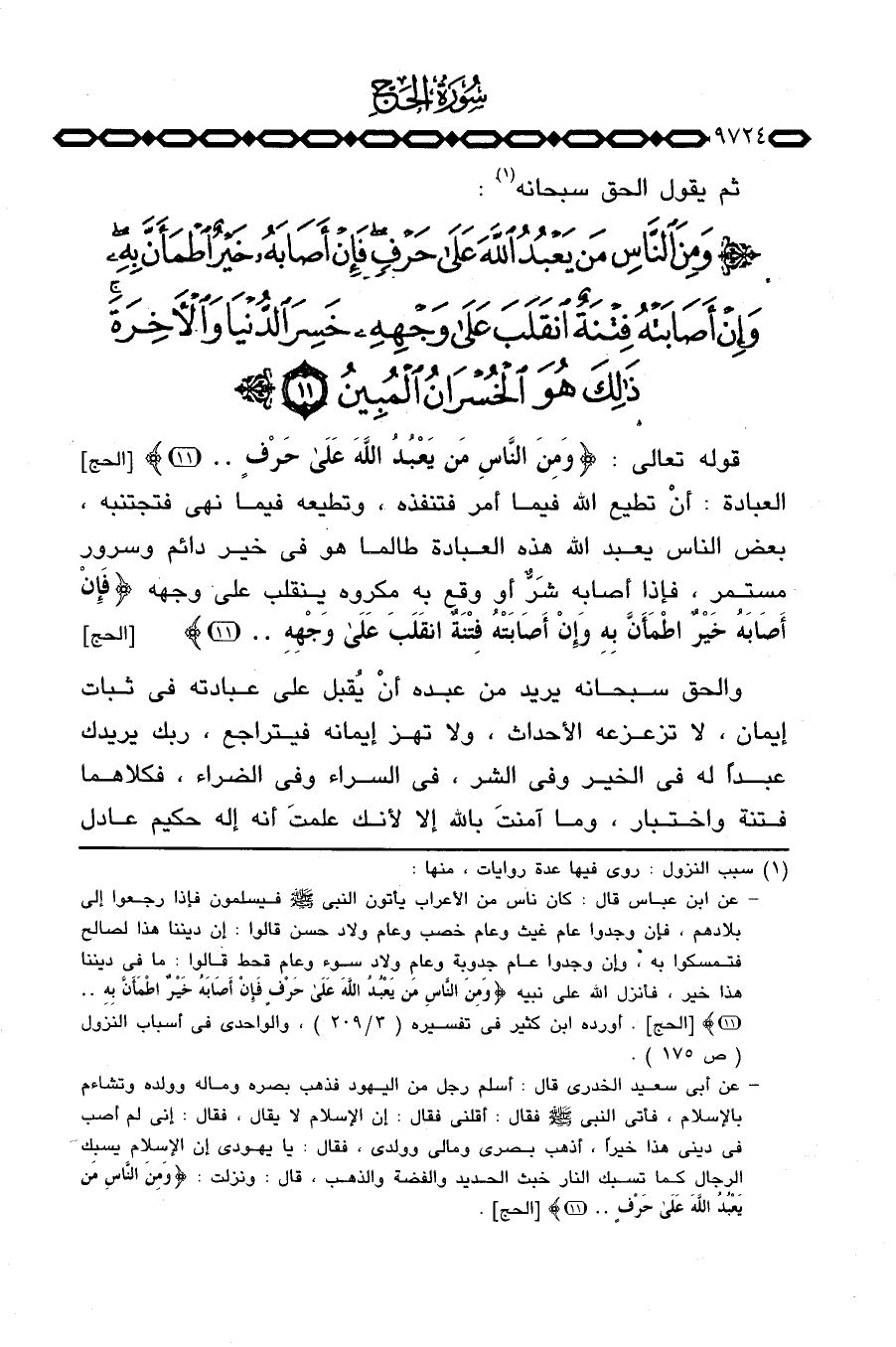 قوله تعالى: {وَمِنَ الناس مَن يَعْبُدُ الله على حَرْفٍ. .} [الحج: 11] العبادة: أنْ تطيع الله فيما أمر فتنفذه، وتطيعه فيما نهى فتجتنبه، بعض الناس يعبد الله هذه العبادة طالما هو في خير دائم وسرور مستمر، فإذا أصابه شَرٌّ أو وقع به مكروه ينقلب على وجهه {فَإِنْ أَصَابَهُ خَيْرٌ اطمأن بِهِ وَإِنْ أَصَابَتْهُ فِتْنَةٌ انقلب على وَجْهِهِ. .} [الحج: 11]
