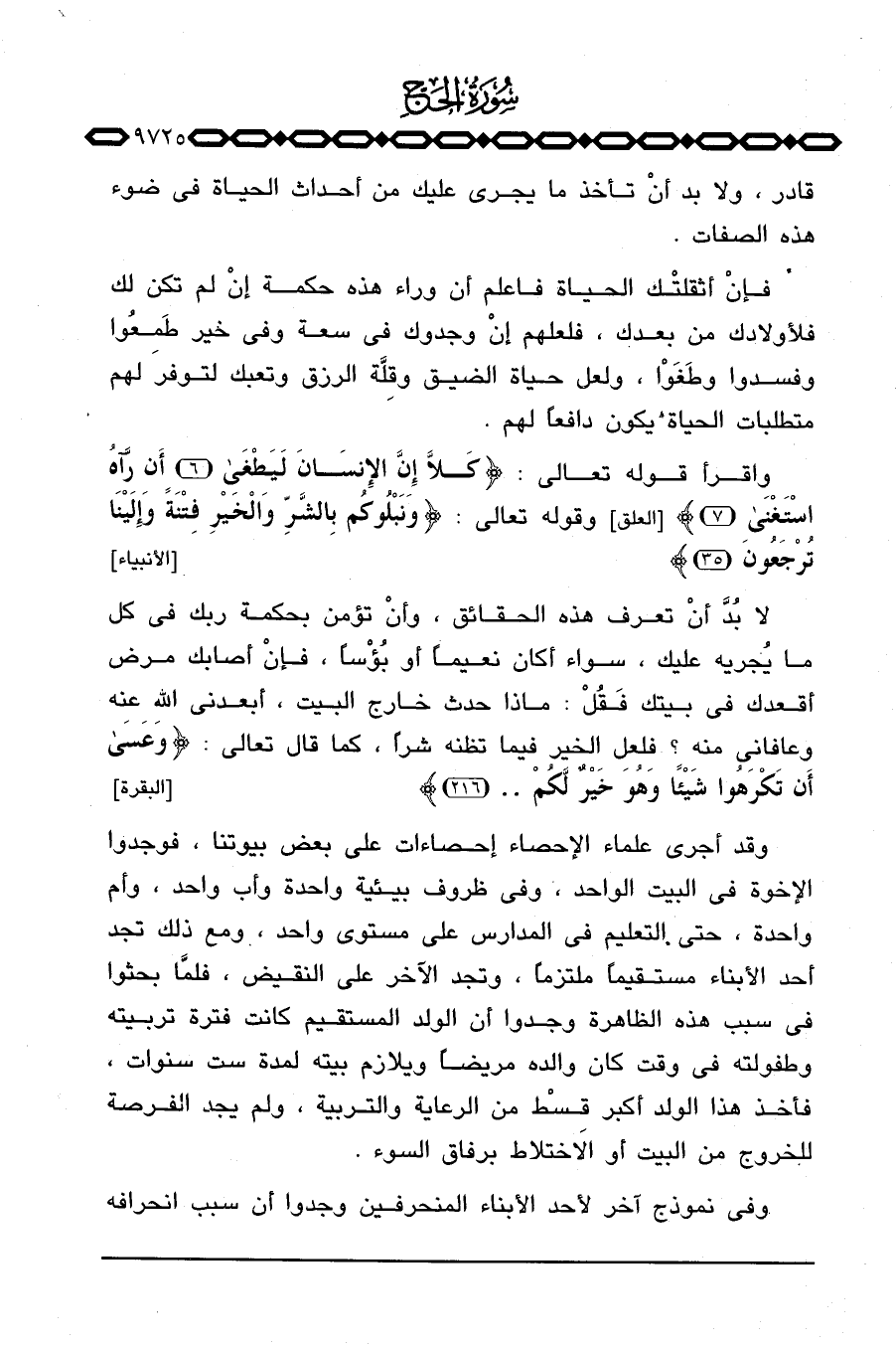 وقد أجرى علماء الإحصاء إحصاءات على بعض بيوتنا، فوجدوا الإخوة في البيت الواحد، وفي ظروف بيئية واحدة وأب واحد، وأم واحدة، حتى التعليم في المدرس على مستوى واحد، ومع ذلك تجد أحد الأبناء مستقيماً ملتزماً، وتجد الآخر على النقيض، فلمَّا بحثوا في سبب هذه الظاهرة وجدوا أن الولد المستقيم كانت فترة تربيته وطفولته في وقت كان والده مريضاً ويلازم بيته لمدة ست سنوات، فأخذ هذا الولد أكبر قِسْط من الرعاية والتربية، ولم يجد الفرصة للخروج من البيت أو الاختلاط برفاق السوء.