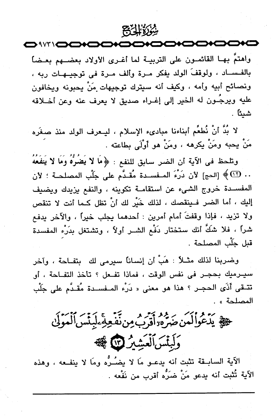 وتلحظ في الآية أن الضر سابق للنفع: {مَا لاَ يَضُرُّهُ وَمَا لاَ يَنفَعُهُ. .} [الحج: 12] لأن دَرْءَ المفسدة مُقدَّم على جَلْب المصلحة؛ لأن المفسدة خروج الشيء عن استقامة تكوينه، والنفع يزيدك ويضيف إليك، أما الضر فينقصك، لذلك خَيْر لك أنْ تظل كما أنت لا تنقص ولا تزيد، فإذا وقفتَ أمام أمرين: أحدهما يجلب خيراً، والآخر يدفع شراً، فلا شَكَّ أنك ستختار دَفْع الشر أولاً، وتشتغل بدَرْءِ المفسدة قبل جَلْب المصلحة.