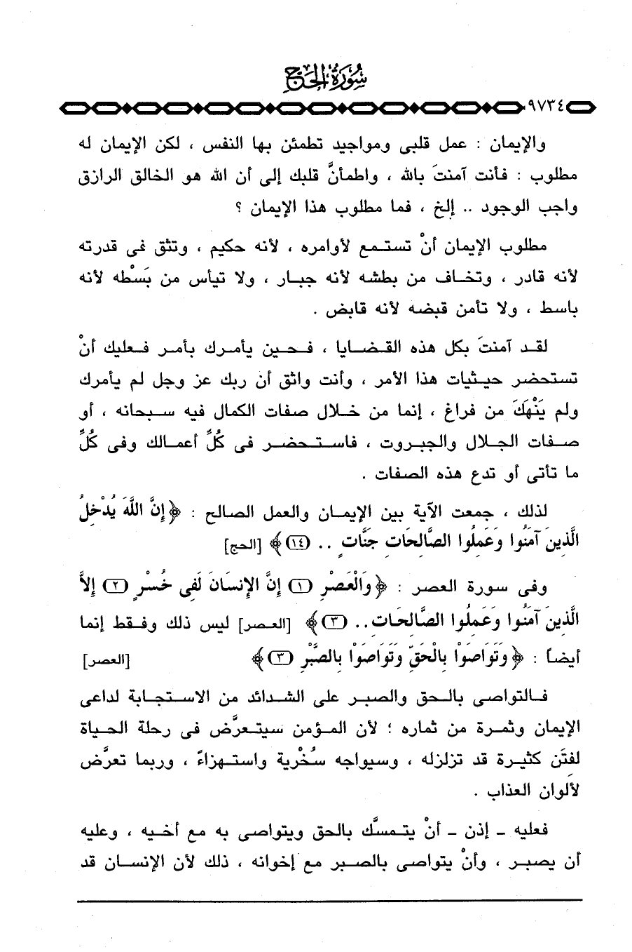 وفي سورة العصر: {والعصر إِنَّ الإنسان لَفِى خُسْرٍ إِلاَّ الذين آمَنُواْ وَعَمِلُواْ الصالحات. .} [العصر: 1 - 3] ليس ذلك وفقط إنما أيضاً: {وَتَوَاصَوْاْ بالحق وَتَوَاصَوْاْ بالصبر} [العصر: 3] .