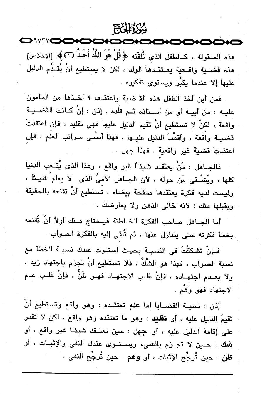 هذه المقولة، كالطفل الذي نُلقّنه {قُلْ هُوَ الله أَحَدٌ} [الإخلاص: 1] هذه قضية واقعية يعتقدها الولد، لكن لا يستطيع أنْ يُقدِّم الدليل عليها إلا عندما يكُبر ويستوي تفكيره.