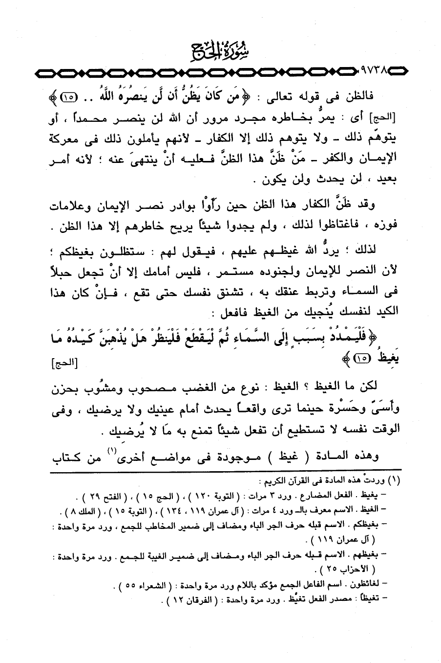 لذلك؛ يردُّ الله غيظهم عليهم، فيقول لهم: ستظلون بغيظكم؛ لأن النصر للإيمان ولجنوده مستمر، فليس أمامك إلا أنْ تجعل حبلاً في السماء وتربط عنقك به، تشنق نفسك حتى تقع، فإنْ كان هذا الكيد لنفسك يُنجيك من الغيظ فافعل: {فَلْيَمْدُدْ بِسَبَبٍ إِلَى السمآء ثُمَّ لْيَقْطَعْ فَلْيَنْظُرْ هَلْ يُذْهِبَنَّ كَيْدُهُ مَا يَغِيظُ} [الحج: 15] .