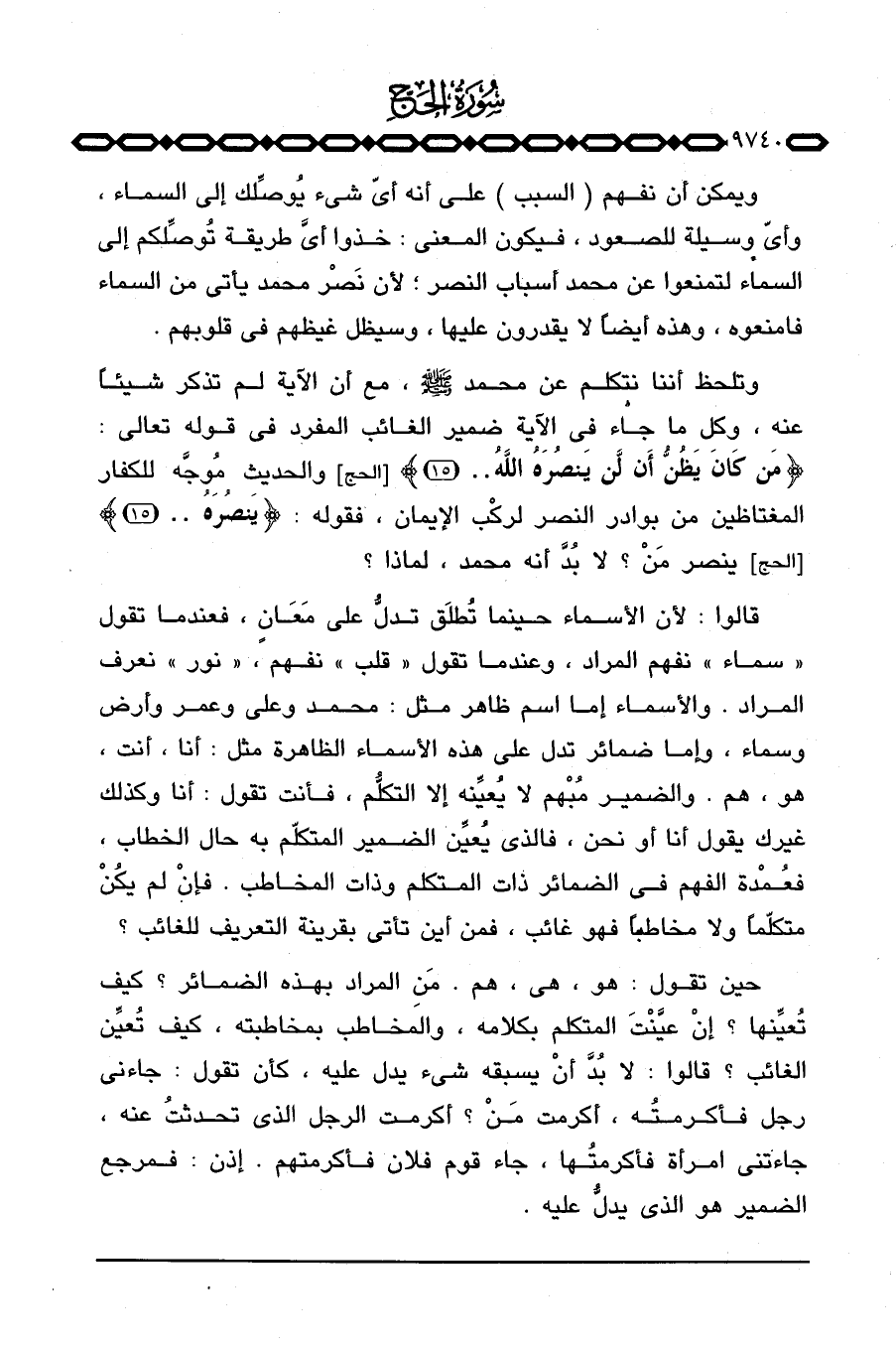 وتلحظ أننا نتكلم عن محمد صَلَّى اللَّهُ عَلَيْهِ وَسَلَّم َ، مع أن الآية لم تذكر شيئاً عنه، وكل ما جاء في الآية ضمير الغائب المفرد في قوله تعالى: {مَن كَانَ يَظُنُّ أَن لَّن يَنصُرَهُ الله. .} [الحج: 15] والحديث مُوجَّه للكفار المغتاظين من بوادر النصر لركْب الإيمان، فقوله: {يَنصُرَهُ. .} [الحج: 15] ينصر مَنْ؟ لا بُدَّ أنه محمد، لماذا؟