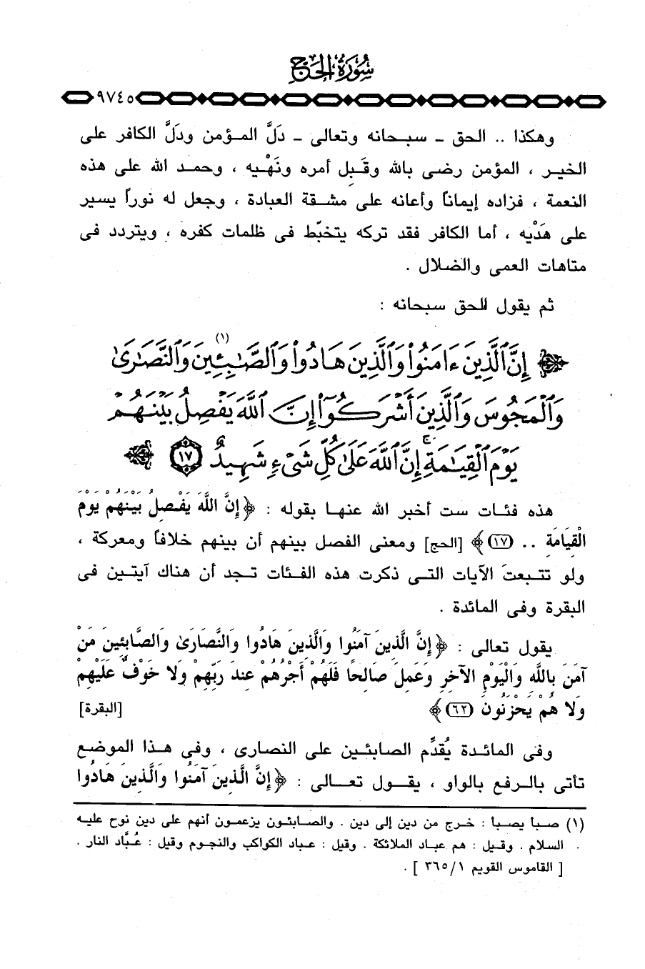 هذه فئات ست أخبر الله عنها بقوله: {إِنَّ الله يَفْصِلُ بَيْنَهُمْ يَوْمَ القيامة. .} [الحج: 17] ومعنى الفصل بينهم أن بينهم خلافاً ومعركة، ولو تتبعتَ الآيات التي ذكرت هذه الفئات تجد أن هناك آيتين في البقرة وفي المائدة.