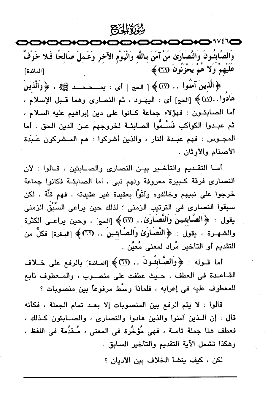 قالوا: لا يتم الرفع بين المنصوبات إلا بعد تمام الجملة، فكأنه قال: إن الذين آمنوا والذين هادوا والنصارى، والصابئون كذلك، فعطف هنا جملة تامة، فهي مُؤخَّرة في المعنى، مُقدَّمة في اللفظ، وهكذا تشمل الآية التقديم والتأخير السابق.