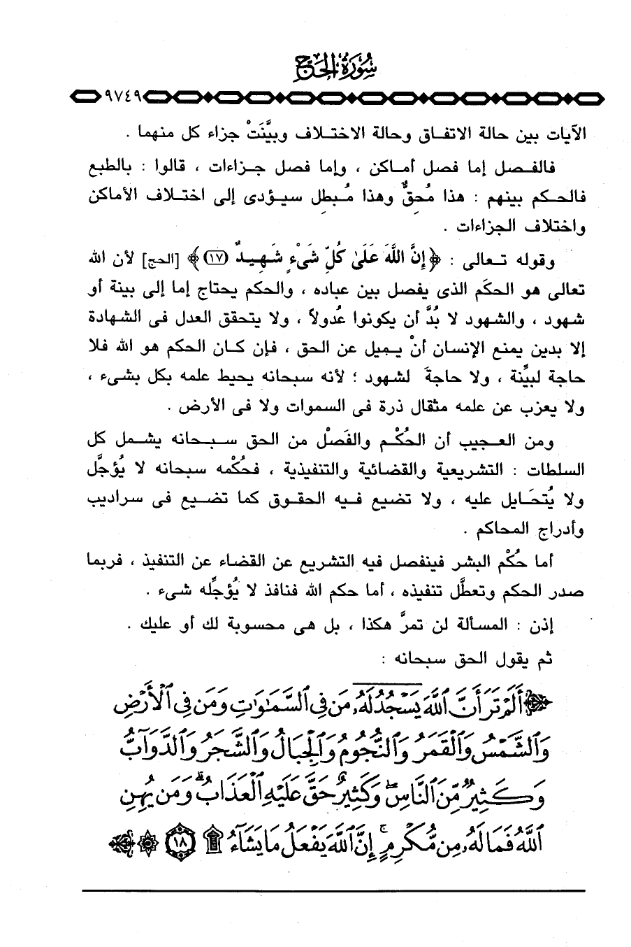 وقوله تعالى: {إِنَّ الله على كُلِّ شَيْءٍ شَهِيدٌ} [الحج: 17] لأن الله تعالى هو الحكَم الذي يفصل بين عباده، والحكم يحتاج إما إلى بينة أو شهود، والشهود لا بُدَّ أن يكونوا عُدولاً، ولا يتحقق العدل في الشهادة إلا بدين يمنع الإنسان أنْ يميل عن الحق، فإن كان الحكم هو الله فلا حاجة لبيِّنة، ولا حاجةَ لشهود؛ لأنه سبحانه يحيط علمه بكل شيء، ولا يعزب عن علمه مثقال ذرة في السموات ولا في الأرض.