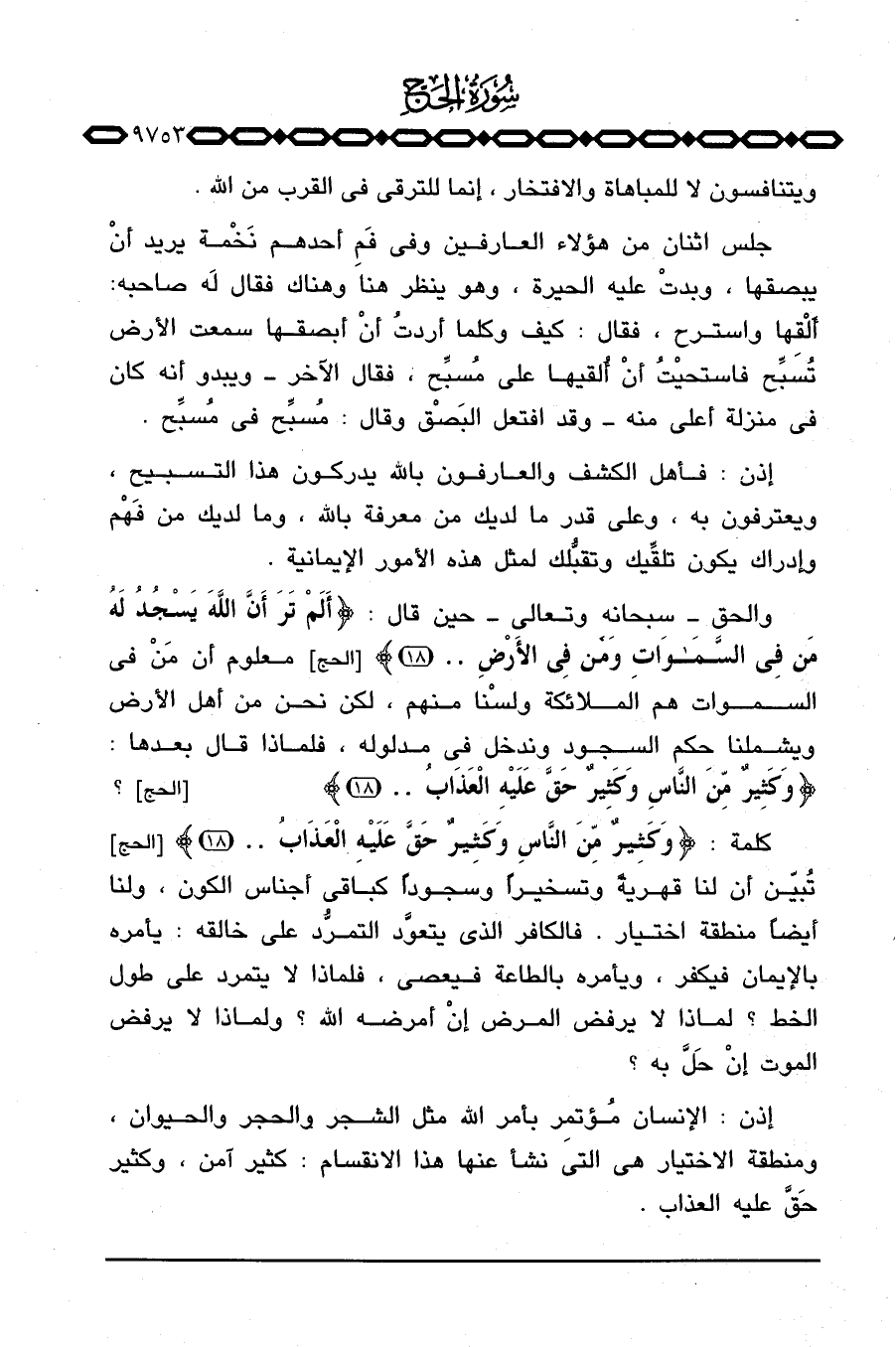 كلمة: {وَكَثِيرٌ مِّنَ الناس وَكَثِيرٌ حَقَّ عَلَيْهِ العذاب. .} [الحج: 18] تُبيّن أن لنا قهريةً وتسخيراً وسجوداً كباقي أجناس الكون، ولنا أيضاً نطقة اختيار. فالكافر الذي يتعوَّد التمرُّد على خالقه: يأمره بالإيمان فيكفر، ويأمره بالطاعة فيعصي، فلماذا لا يتمرد على طول الخط؟ لماذا لا يرفض المرض إنْ أمرضه الله؟ ولماذا لا يرفض الموت إنْ حَلَّ به؟