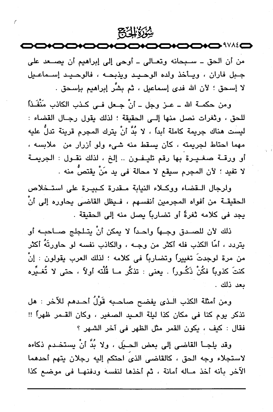 ومن حكمة الله - عَزَّ وَجَلَّ - أنْ جعل في كذب الكاذب مَنْفذاً للحق، وثغرات نصل منها إلى الحقيقة؛ لذلك يقول رجال القضاء: ليست هناك جريمة كاملة أبداً، لا بُدَّ أنْ يترك المجرم قرينة تدلُّ عليه مهما احتاط لجريمته، كأن يسقط منه شيء ولو أزرار من ملابسه، أو ورقة صغيرة بها رقم تليفون. . إلخ، لذلك نقول: الجريمة لا تفيد؛ لأن المجرم سيقع لا محالة في يد مَنْ يقتصُّ منه.
