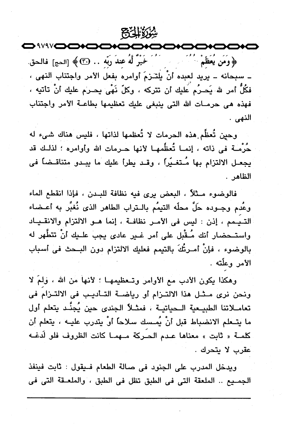 وهكذا يكون الأدب مع الأوامر وتعظيمها؛ لأنها من الله، ولِمَ لا ونحن نرى مثل هذا الالتزام أو رياضة التأديب في الالتزام في تعاملاتنا الطبيعية الحياتية، فمثلاً الجندي حين يُجنَّد يتعلم أول ما يتعلم الانضباط قبل أنْ يُمسِك سلاحاً أوْ يتدرب عليه، يتعلم أن كلمة «ثابت» معناها عدم الحركة مهما كانت الظروف فلو لَدغه عقرب لا يتحرك.