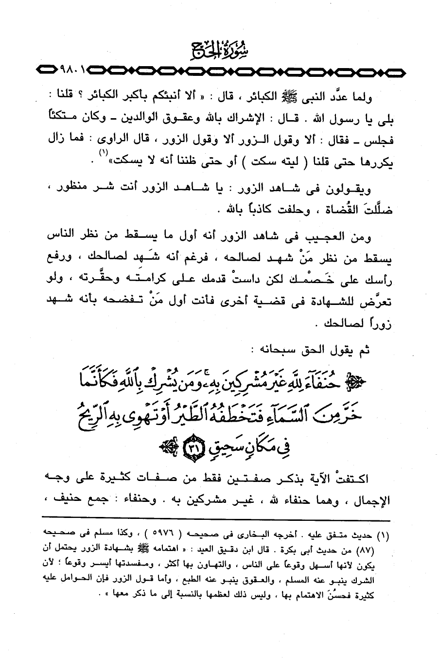 اكتفتْ الآية بذكر صفتين فقط من صفات كثيرة على وجه الإجمال، وهما حنفاء لله، غير مشركين به، وحنفاء: جمع حنيف،