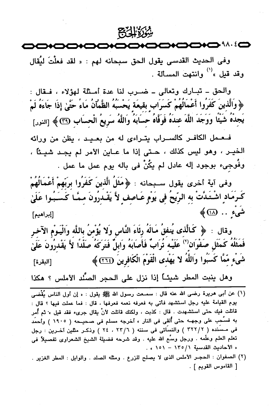 وقال: {كالذي يُنْفِقُ مَالَهُ رِئَآءَ الناس وَلاَ يُؤْمِنُ بالله واليوم الآخر فَمَثَلُهُ كَمَثَلِ صَفْوَانٍ عَلَيْهِ تُرَابٌ فَأَصَابَهُ وَابِلٌ فَتَرَكَهُ صَلْداً لاَّ يَقْدِرُونَ على شَيْءٍ مِّمَّا كَسَبُواْ والله لاَ يَهْدِي القوم الكافرين. .} [البقرة: 264] .