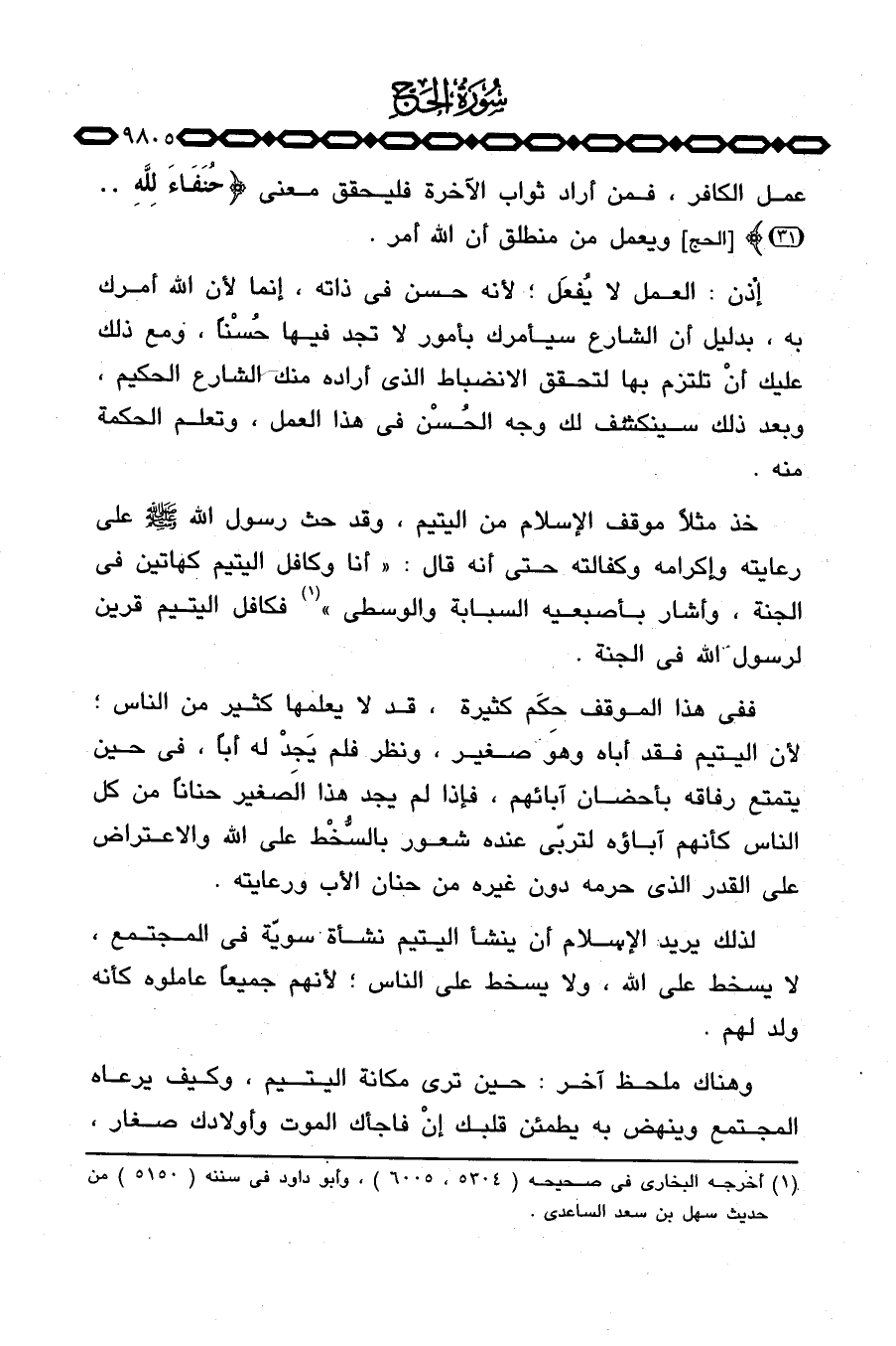 خذ مثلاً موقف الإسلام من اليتيم، وقد حث رسول الله صَلَّى اللَّهُ عَلَيْهِ وَسَلَّم َ على رعايته وإكرامه وكفالته حتى أنه قال: «أنا وكافل اليتيم كهاتين في الجنة، وأشار بأصبعيه السبابة والوسطى» فكافل اليتيم قرين لرسول الله في الجنة.