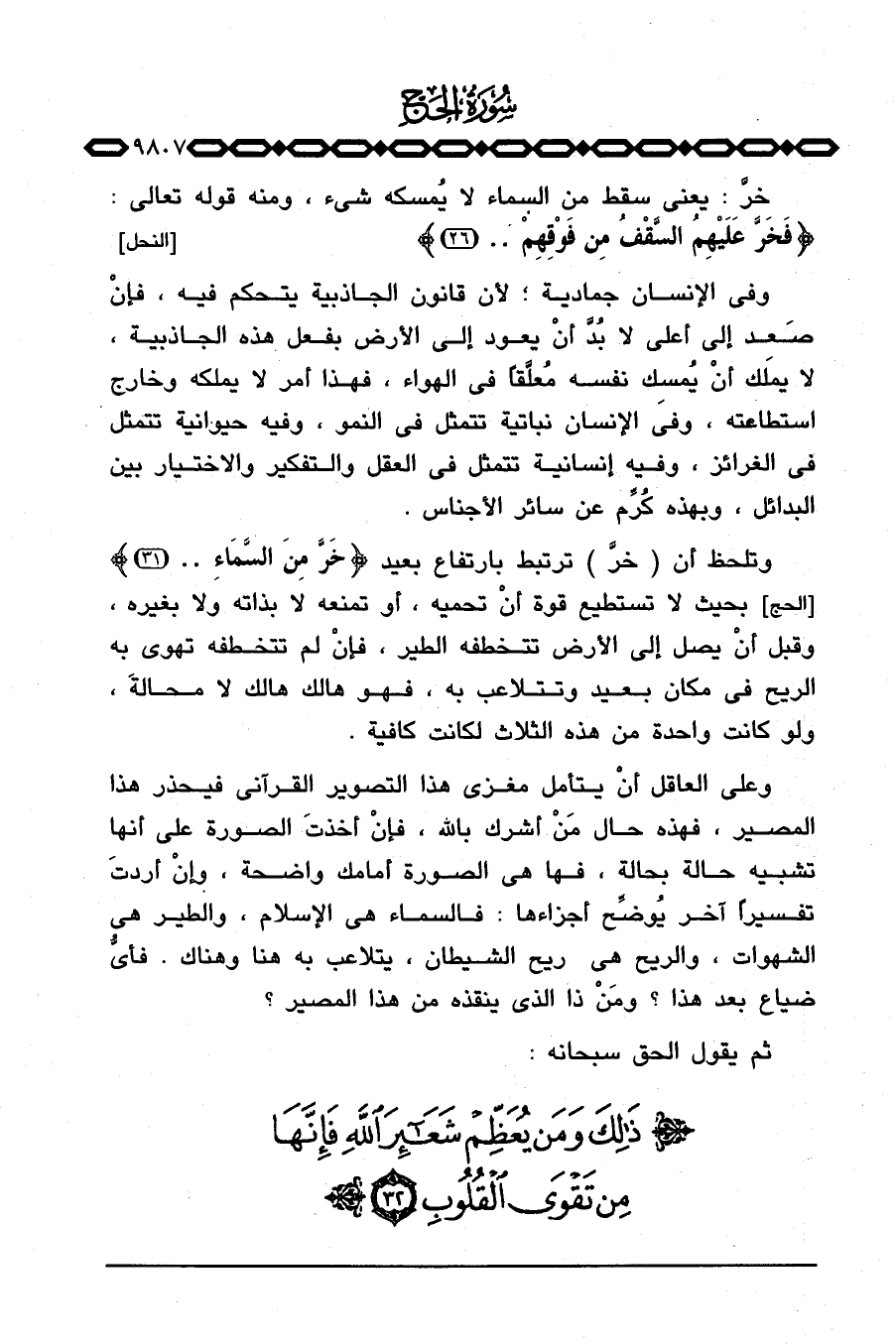 وعلى العاقل أنْ يتأمل مغزى هذا التصوير القرآني فيحذر هذا المصير، فهذه حال مَنْ أشرك بالله، فإنْ أخذتَ الصورة على أنها تشبيه حالة بحالة، فها هي الصورة أمامك واضحة، وإنْ أردتَ تفسيراً آخر يُوضِّح أجزاءها: فالسماء هي الإسلام، والطير هي الشهوات، والريح هي ريح الشيطان، يتلاعب به هنا وهناك. فأيُّ ضياع بعد هذا؟ ومَنْ ذا الذي ينقذه من هذا المصير؟