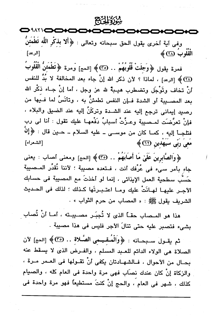 {والصابرين على مَآ أَصَابَهُمْ. .} [الحج: 35] ومعنى أصاب: يعني جاء بأمر سيء في عُرْفك أنت، فتعده مصيبة؛ لأننا نُقدِّر المصيبة حَسْب سطحية العمل الإيذائي، إنما لو أخذتَ مع المصيبة في حسابك الأجر عليها لهانَتْ عليك وما أعتبرتَها كذلك؛ لذلك في الحديث الشريف يقول صَلَّى اللَّهُ عَلَيْهِ وَسَلَّم َ: «المصاب من حرم الثواب» .