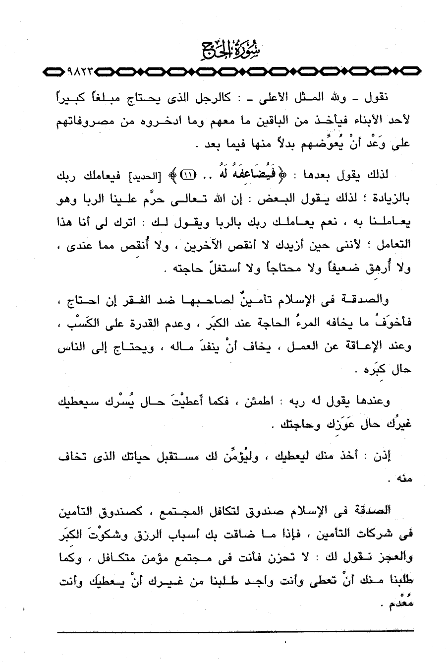 الصدقة في الإسلام صندوق لتكافل المجتمع، كصندوق التأمين في شركات التأمين، فإذا ما ضاقت بك أسباب الرزق وشكوْتَ الكِبَر والعجز نقول لك: لا تحزن فأنت في مجتمع مؤمن متكافل، وكما طلبنا منك أنْ تعطي وأنت واجد طلبنا من غيرك أنْ يعطيَك وأنت مُعْدم.