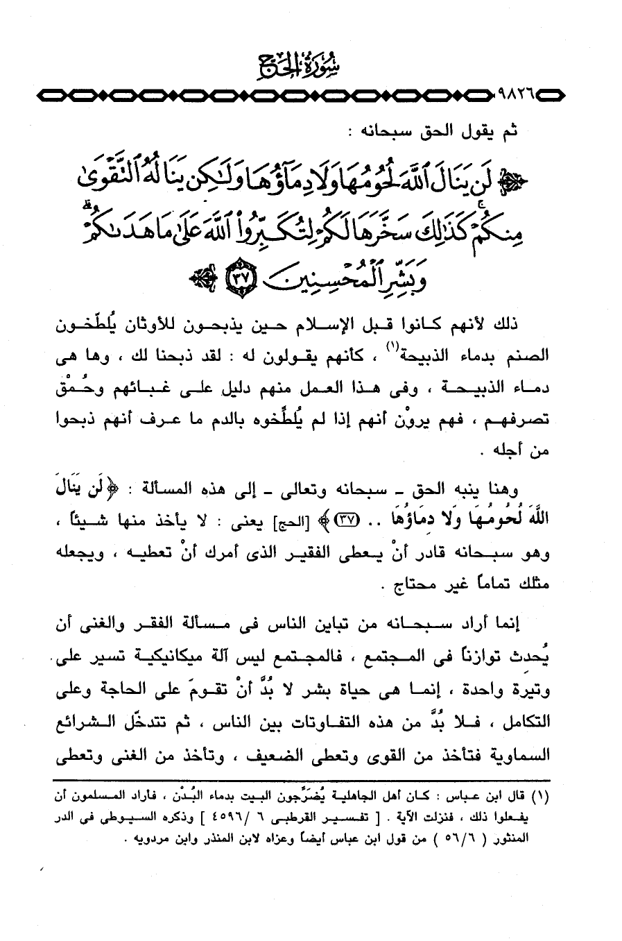 ثم يقول الحق سبحانة: {لَن يَنَالَ الله لُحُومُهَا وَلاَ دِمَآؤُهَا ولكن يَنَالُهُ التقوى مِنكُمْ. .} .