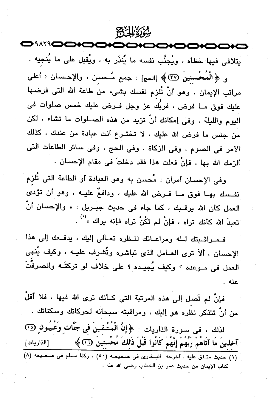 وفي الإحسان أمران: مُحسن به وهو العبادة أو الطاعة التي تُلزِم نفسك بها فوق ما فرض الله عليك، ودافعٌ عليه، وهو أن تؤدي العمل كأن الله يرقبك، كما جاء في حديث جبريل: «والإحسان أنْ تعبدَ الله كأنك تراه، فإنْ لم تكُنْ تراه فإنه يراك» .
