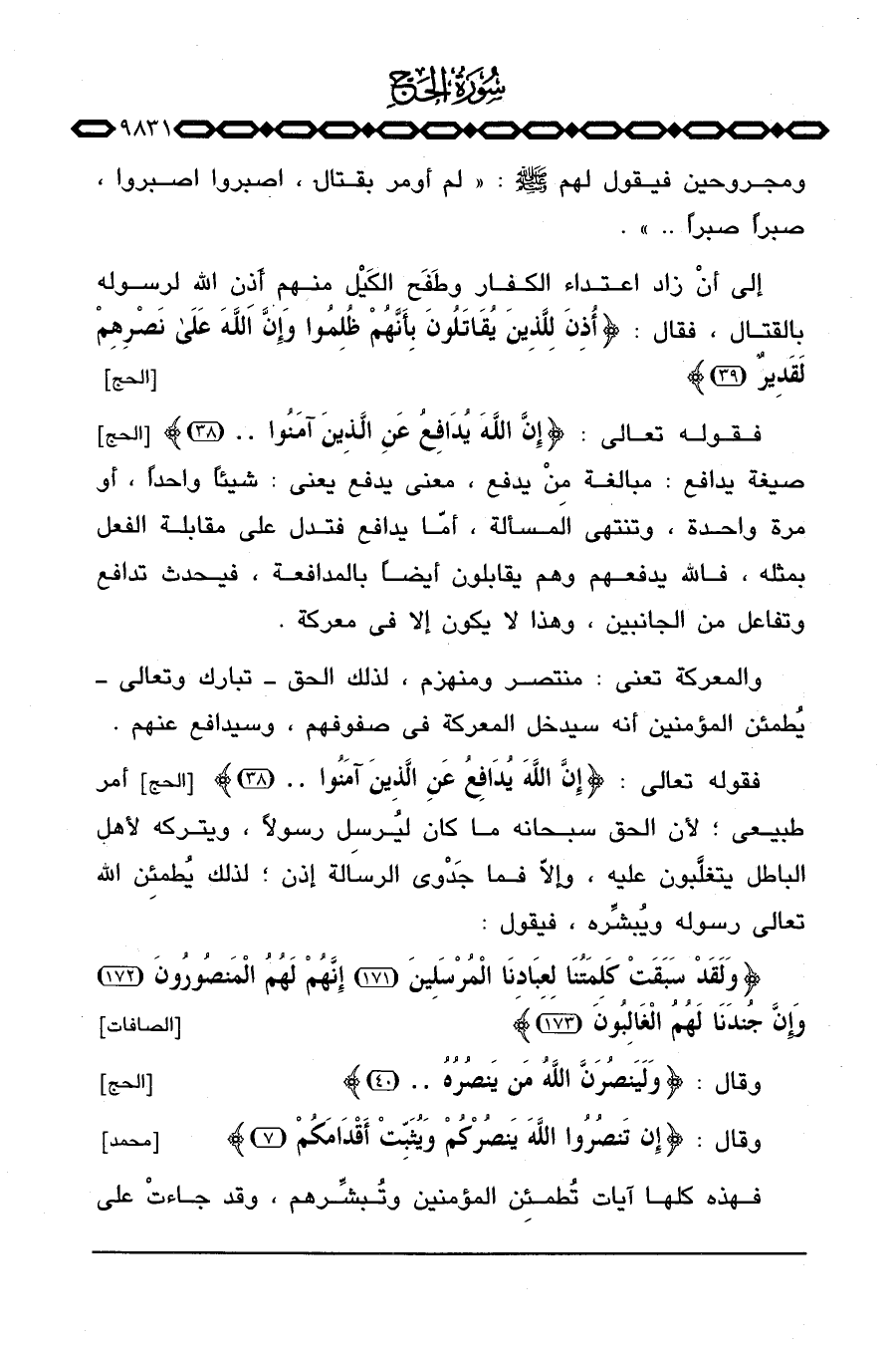 إلى أنْ زاد اعتداء الكفار وطََفَح الكَيْل منهم أَذن الله لرسوله بالقتال، فقال: {أُذِنَ لِلَّذِينَ يُقَاتَلُونَ بِأَنَّهُمْ ظُلِمُواْ وَإِنَّ الله على نَصْرِهِمْ لَقَدِيرٌ} [الحج: 39] .