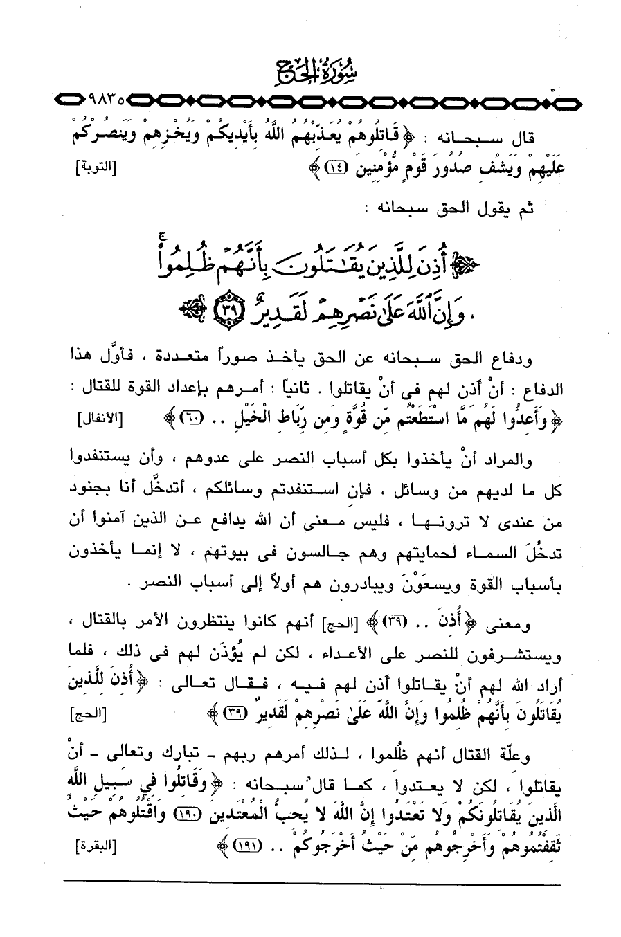 وعِلّة القتال أنهم ظُلِموا، لذلك أمرهم ربهم - تبارك وتعالى - أنْ يقاتلوا، لكن لا يعتدوا، كما قال سبحانه: {وَقَاتِلُواْ فِي سَبِيلِ الله الذين يُقَاتِلُونَكُمْ وَلاَ تعتدوا إِنَّ الله لاَ يُحِبُّ المعتدين واقتلوهم حَيْثُ ثَقِفْتُمُوهُم وَأَخْرِجُوهُمْ مِّنْ حَيْثُ أَخْرَجُوكُمْ. .} [البقرة: 190 - 191] .