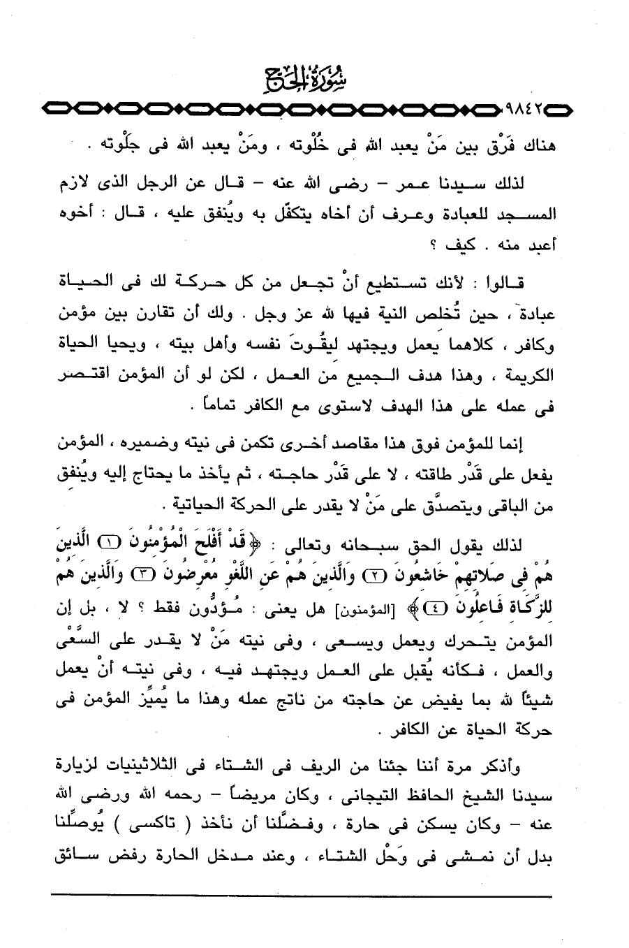لذلك يقول الحق سبحانه وتعالى: {قَدْ أَفْلَحَ المؤمنون الذين هُمْ فِي صَلاَتِهِمْ خَاشِعُونَ والذين هُمْ عَنِ اللغو مُّعْرِضُونَ والذين هُمْ لِلزَّكَاةِ فَاعِلُونَ} [المؤمنون: 1 - 4] هل يعني: مُؤدُّون فقط؟ لا، بل إن المؤمن يتحرك ويعمل ويسعى، وفي نيته مَنْ لا يقدر على السَّعْي والعمل، فكأنه يُقبل على العمل ويجتهد فيه، وفي نيته أنْ يعمل شيئاً لله بما يفيض عن حاجته من ناتج عمله وهذا ما يُميِّز المؤمن في حركة الحياة عن الكافر.