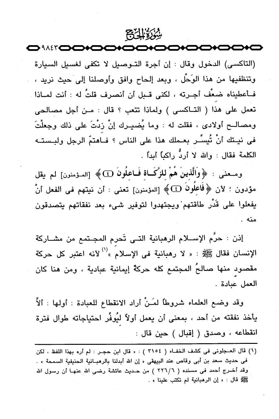 التاكسي) الدخول وقال: إن أجرة التوصيل لا تكفي لغسيل السيارة وتنظيفها من هذا الوَحْل، وبعد إلحاح وافق وأوصلنا إلى حيث نريد، فأعطيناه ضِعْف أجرته، لكني قبل أن أنصرف قلتُ له: أنت لماذا تعمل على هذا (التاكسي) ولماذا تتعب؟ قال: من أجل مصالحي ومصالح أولادي، فقلت له: وما يُضيرك إنْ زِدْتَ على ذلك وجعلْتَ في نيتك أنْ تُيسِّر بعملك هذا على الناس؟ فاهتمّ الرجل ولبسته الكلمة فقال: والله لا اردُّ راكباً أبداً.
