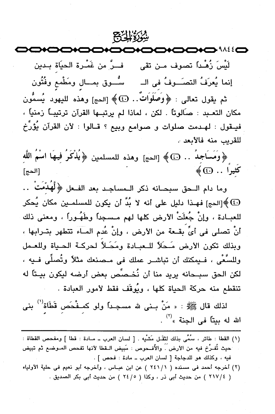 لذلك قال صَلَّى اللَّهُ عَلَيْهِ وَسَلَّم َ: «مَنْ بنى لله مسجداً ولو كمِفْحَصِ قَطَاةٍ بنى الله له بيتاً في الجنة» .