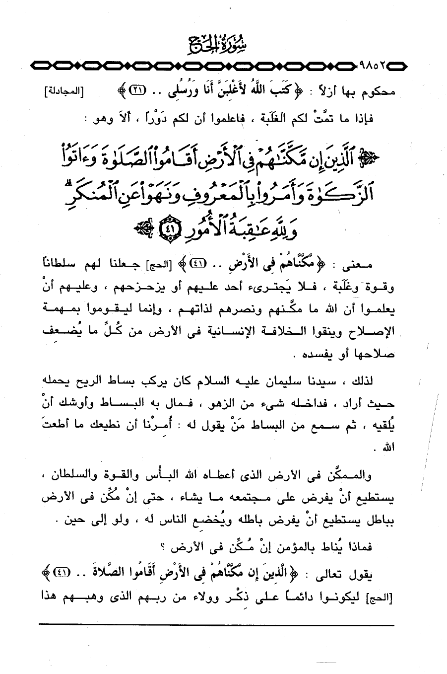 معنى: {مَّكَّنَّاهُمْ فِي الأرض. .} [الحج: 41] جعلنا لهم سلطاناً وقوة وغَلَبة، فلا يَجترئ أحد عليهم أو يزحزحهم، وعليهم أنْ يعلموا أن الله ما مكَّنهم ونصرهم لذاتهم، وإنما ليقوموا بمهمة الإصلاح وينقوا الخلافة الإنسانية في الأرض من كُلِّ ما يُضعِف صلاحها أو يفسده.