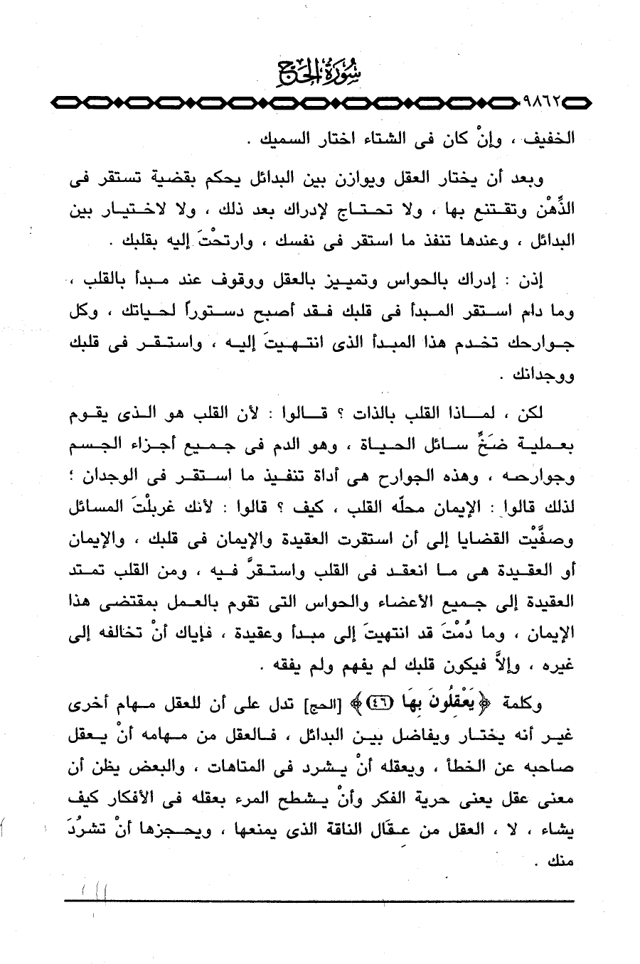 وكلمة {يَعْقِلُونَ بِهَآ. .} [الحج: 46] تدل على أن للعقل مهام أخرى غير أنه يختار ويفاضل بين البدائل، فالعقل من مهامه أنْ يعقل صاحبه عن الخطأ، ويعقله أنْ يشرد في المتاهات، والبعض يظن أن معنى عقل يعني حرية الفكر وأنْ يشطح المرء بعقله في الأفكار كيف يشاء، لا، العقل من عِقَال الناقة الذي يمنعها، ويحجزها أنْ تشرُدَ منك.