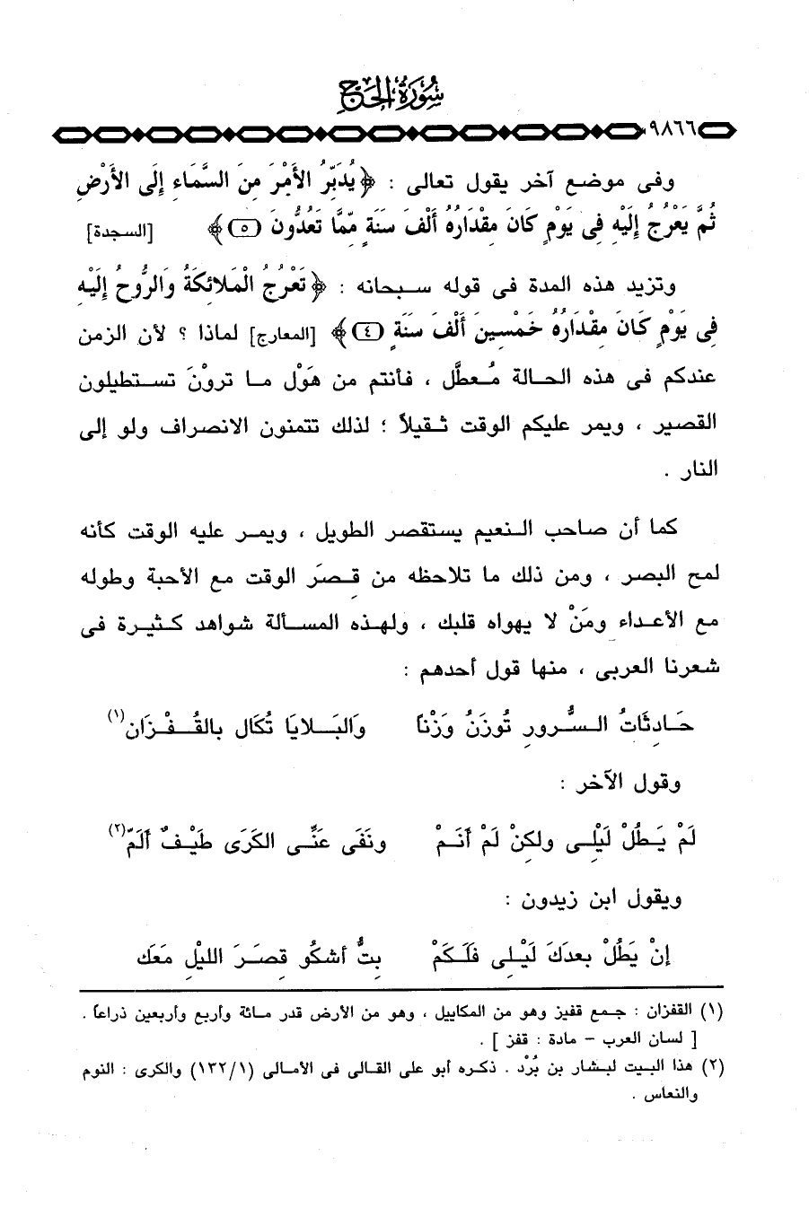 كما أن صاحب النعيم يستقصر الطويل، ويمر عليه الوقت كأنه لمح البصر، ومن ذلك ما تلاحظه من قِصَر الوقت مع الأحبة وطوله مع الأعداء ومَنْ لا يهواه قلبك، ولهذه المسألة شواهد كثيرة في شعرنا العربي، منها قول أحدهم:
