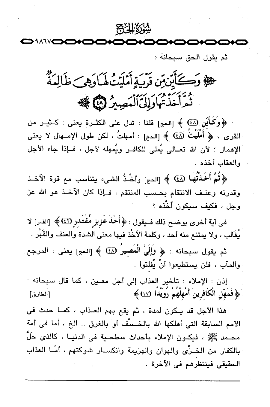 {وَكَأَيِّن. .} [الحج: 48] قلنا: تدل على الكثرة يعني: كثير من القرى، {أَمْلَيْتُ. .} [الحج: 48] : أمهلتُ، لكن طوال الإمهال لا يعني الإهمال؛ لأن الله تعالى يُملي للكافر ويُمهله لأجل، فإذا جاء الأجل والعقاب أخذه.