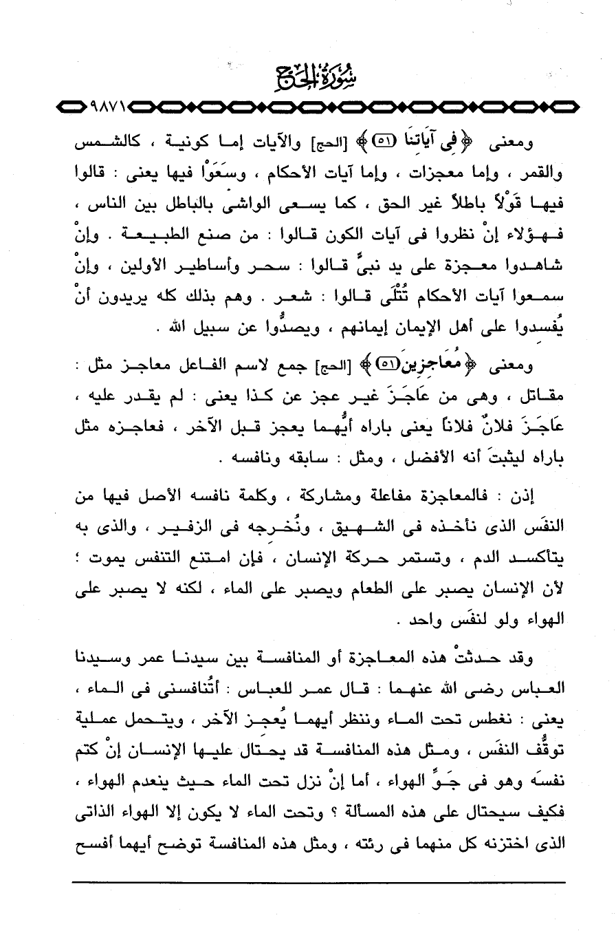 ومعنى {مُعَاجِزِينَ} [الحج: 51] جمع لاسم الفاعل معاجز مثل: مقاتل، وهي من عَاجَزَ غير عجز عن كذا يعني: لم يقدر عليه، عَاجَزَ فلانٌ فلاناً يعني باراه أيُّهما يعجز قبل الآخر، فعاجزه مثل باراه ليثبتَ أنه الأفضل، ومثل: سابقه ونافسه.