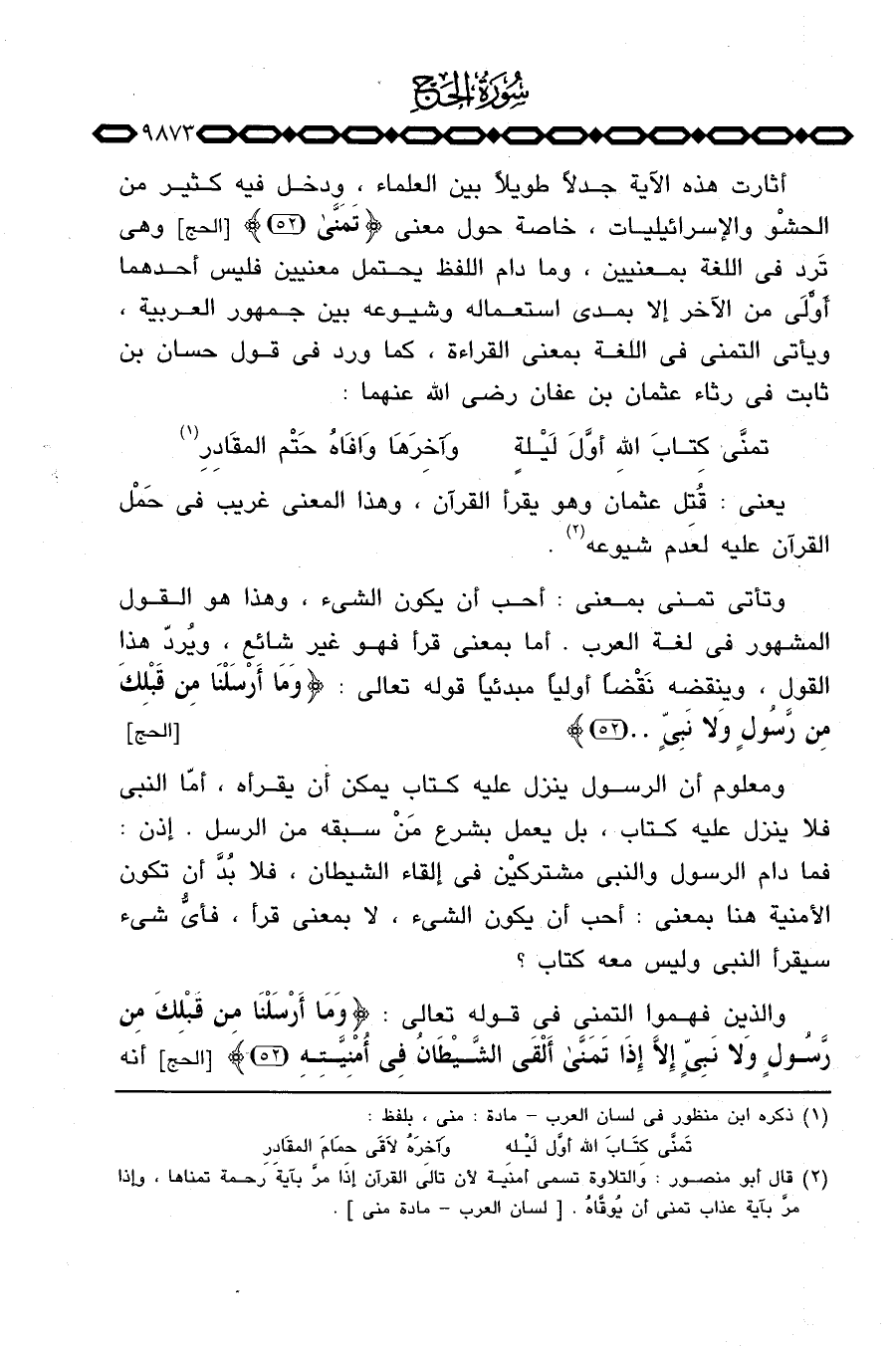 أثارت هذه الآية جَدلاً طويلاً بين العلماء، ودخل فيه كثير من الحشْو والإسرائيليات، خاصة حول معنى {تَمَنَّى} [الحج: 52] وهي تَرد في اللغة بمعنيين، وما دام اللفظ يحتمل معنيين فليس أحدهما أَوَْلَى من الآخر إلا بمدى استعماله وشيوعه بين جمهور العربية، ويأتي التمني في اللغة بمعنى القراءة، كما ورد في قول حسان بن ثابت في رثاء عثمان بن عفان رَضِيَ اللَّهُ عَنْهما: