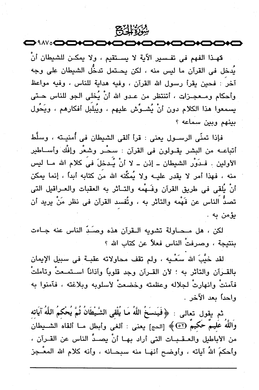 فإذا تمنّى الرسول يعني: قرأ ألقى الشيطان في أُمنيته، وسلَّط أتباعه من البشر يقولون في القرآن: سِحْر وشِعْر وإفْك وأساطير الأولين: فدَوْر الشيطان - إذن - لا أنْ يُدخِلَ في كلام الله ما ليس منه، فهذا أمر لا يقدر عليه ولا يُمكِّنه الله من كتابه أبداً، إنما يمكن أنْ يُلقِي في طريق القرآن وفَهْمه والتأثر به العقبات والعراقيل التي تصدُّ الناس عن فَهْمه والتأثر به، وتُفسِد القرآن في نظر مَنْ يريد أن يؤمن به.