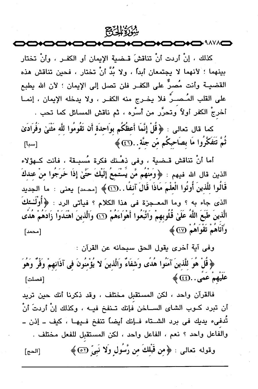 كذلك، إنْ أردت أنْ تناقشَ قضية الإيمان أو الكفر، وأنْ تختار بينهما؛ لأنهما يجتمعان أبداً، ولا بُدَّ أنْ تختار، فحين تناقش هذه القضية وأنت مُصِرٌّ على الكفر فلن تصل إلى الإيمان؛ لأن الله يطبع على القلب المُصِرَّ فلا يخرج منه الكفر، ولا يدخله الإيمان، إنما أخرِجْ الكفر أولاً وتحرّر من أَسْره، ثم ناقش المسائل كما تحب.