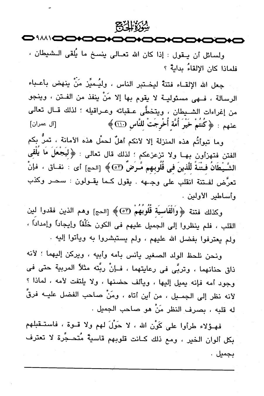 جعل الله الإلقاء فتنةً ليختبر الناس، وليُميِّز مَنْ ينهض بأعباء الرسالة، فهي مسئولية لا يقوم بها إلا مَنْ ينفذ من الفتن، وينجو من إغراءات الشيطان، ويتخطى عقباته وعراقيله؛ لذلك قال تعالى عنهم: {كُنْتُمْ خَيْرَ أُمَّةٍ أُخْرِجَتْ لِلنَّاسِ} [آل عمران: 110] .