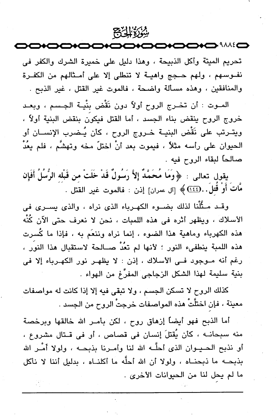 تحريم الميتة وأكل الذبيحة، وهذا دليل على خميرة الشرك والكفر في نفوسهم، ولهم حجج واهية لا تنطلي إلا على أمثالهم من الكفرة والمنافقين، وهذه مسألة واضحة، فالموت غير القتل، غير الذبح.