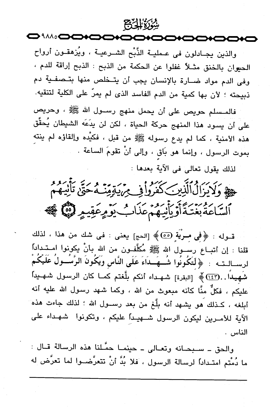 قوله: {فِي مِرْيَةٍ} [الحج: 55] يعني: في شك من هذا، لذلك قلنا: إن أتباع رسوله صَلَّى اللَّهُ عَلَيْهِ وَسَلَّم َ مُكلَّفون من الله بأنْ يكونوا امتداداً لرسالته: {لِّتَكُونُواْ شُهَدَآءَ عَلَى الناس وَيَكُونَ الرسول عَلَيْكُمْ شَهِيداً. .} [البقرة: 143] شهداء أنكم بلَّغتم كما كان الرسول شهيداً عليكم، فكلٌّ مِنَّا كأنه مبعوث من الله، وكما شهد رسول الله عليه أنه أبلغه، كذلك هو يشهد أنه بلَّغ من بعد رسول الله؛ لذلك جاءت هذه الآية للأمرين ليكون الرسول شهيداً عليكم، وتكونوا شهداء على الناس.